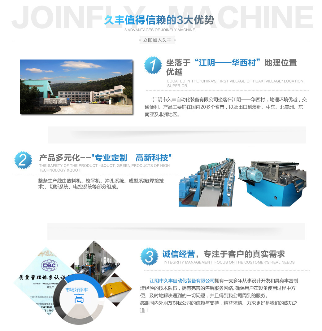 ????????江陰市久豐自動化裝備有限公司是坐落在華西村,專業生產各類高精度冷司成型生產線。主要產品有電纜橋架、建筑用腳踏板、高速公路護欄板、C/Z型鋼和輕鋼龍骨系列高精度冷彎成型生產線,并根據用戶要求,設計制造各類復雜的非標冷彎機組。