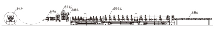 整條生產線由放料系統、校平系統、沖孔/切斷系統、成型系統、電控系統等部分組成。